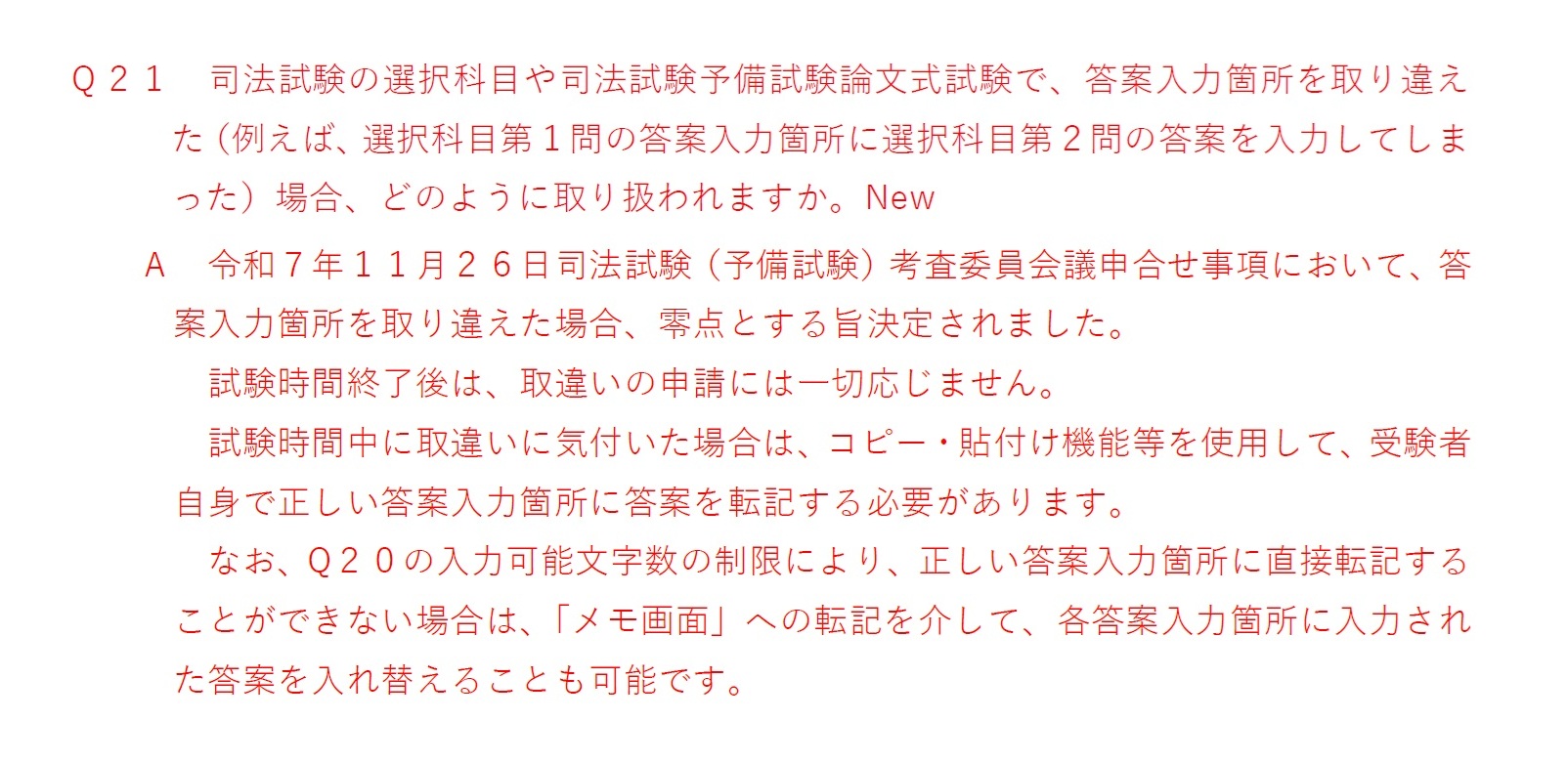 2025年12月3日付けで、司法試験等のCBT方式の導入及び出願手続のオンライン化に関するQ&Aが更新されました。